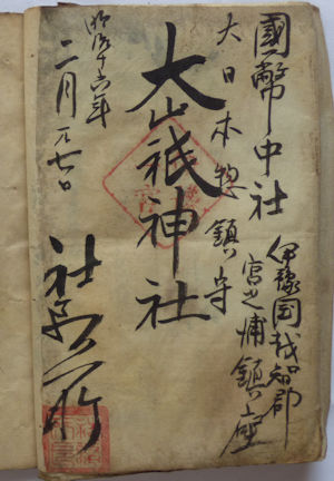 (1)明治16年(1883)の御朱印。中央の朱印は「伊豫一宮」、左下の印は「社務所印」。墨書は「國幣中社/伊豫国越智郡宮之浦鎮座/大日本惣鎮守/大山祇神社/社務所」。
