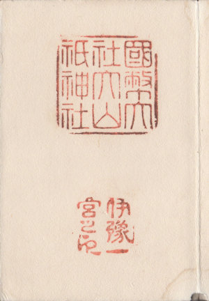(3)昭和4年(1929)頃の御朱印。上の朱印は「國幣大社大山祇神社」で、昭和17年の『惟神の礎』にはこの印が掲載されている。下の印は「國幣大社大山祇神社務所印」。
