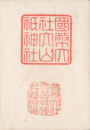 (1)明治20年(1887)の御朱印。木版刷りの書き置き。中央の朱印は判読しづらいが「高良神社神印」と思われる。左下の印は「社務所印」。文字は木版で「福岡縣筑後國御井郡御井町/國幣中社/高良神社/社務所」。