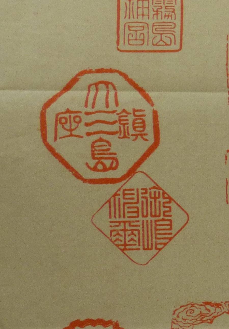 (1)明治12年(1879)の御朱印。中央と左下の朱印は同一のもので「多度神社社務所之印」。墨書は「伊勢國縣社/多度神社/社務所」。