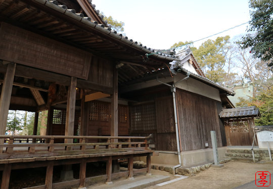 東温市立南吉井小学校のすぐ近く、県道193号線の南側に鎮座する。社殿は南面しているが、県道に面する北側参道がメインになっているようで、鳥居も北側参道と長慶天皇陵に面する西側参道にはあるが、社殿正面の南側参道には注連柱が建つだけである。ただし、北側参道がメインになったのは県道との位置関係ではなく、牛渕村の集落が神社の南から北へ移動したことと関連するのかも知れない。